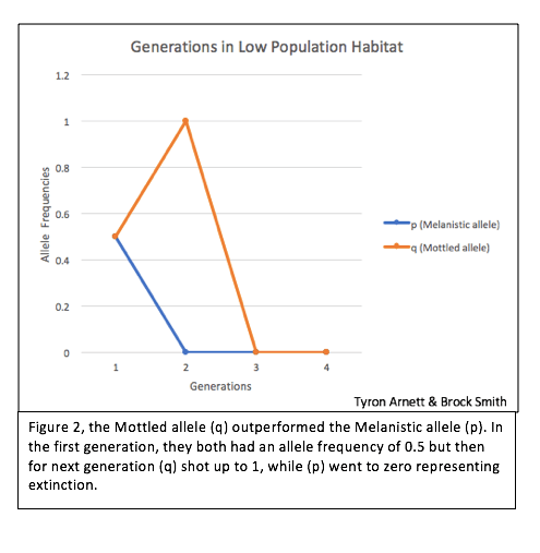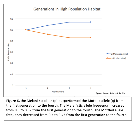 -The “p” (Melanistic) allele increased through the 4 generations in the high and moderate pollution environmental setting. Due to it being the dominant trait, it was more acceptable to survive in the environment. Opposed “q” (Mottled) allele representing the recessive trait of the moth. Due to the moth being in the mottled form in the moderate and high pollution environmental settings, results negatively display the allele at a constant decline. From the moth being in the lighter in the dark environment setting, they were vulnerable to predation.