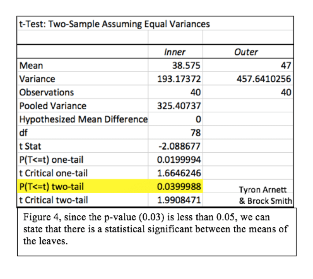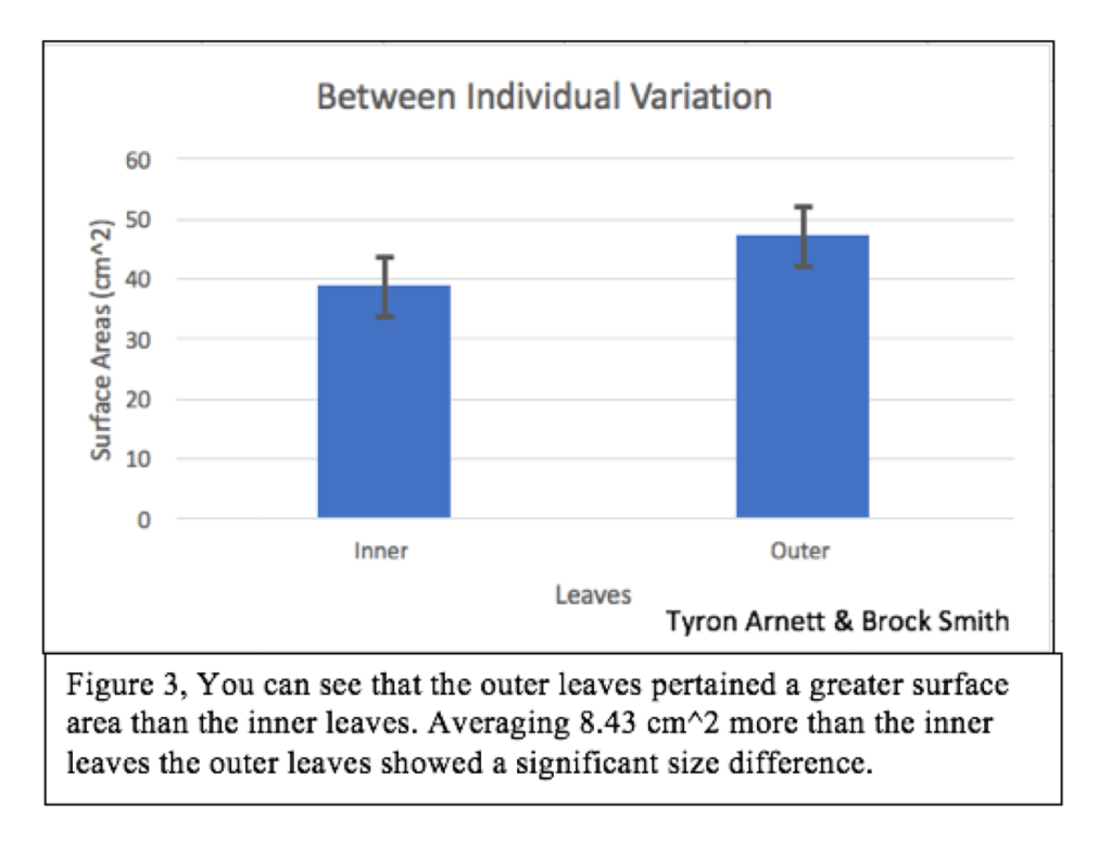 -The Within Individual Variation represents individual results. The Between Individual Variation represents the class results. In my individual data results, outer leaves (39.8 cm^2) had a greater surface area average than inner leaves (26.1 cm^2). Also, since the p-value (0.001) is less than 0.05, we can state that there is a statistical significant between the means of the leaves. In the class results, the outer leaves (47 cm^2) had a greater surface area average than inner leaves (38.5 cm^2). Also, since the p-value (0.03) is less than 0.05, we can state that there is a statistical significant between the means of the leaves.