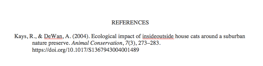 -The researchers in the article Ecological impact of inside/outside house cats arounda suburban nature preserve wanted to determine what type of impact that the hunting house cats were having on the ecology of their home ranges. They found that there was an average of 0.275 Inside Outside House Cats (IOHC) per house. (Kays, 2004) These IOHC averaged 1.67 prey per home per cat per month. (Kays, 2004) They found that there was no significant relationship between the number of cats in an area and the number of wild animals in an area. They speculated that the ecological impact of these cats was minimized by cold weather and cat predator populations. They also found that the cats had relatively small home ranges that rarely overlapped with forested areas. They found that most of the cats hunting activity occurred within these small areas as well. The cats in the study mainly stuck to their own properties or ventured into their neighbor’s gardens. This is consistent with our data that the cats generally stick to familiar territory and do not venture too far from their home range which minimizes their ecological impact. The researchers hypothesized that the cats are less likely to affect the surrounding populations because of their reliance on human reaction. (Kays, 2004) It requires less energy for a cat to be reliant on humans for nourishment than to have to hunt for it on their own. These domesticated cats are not driven by hunger and therefore do not greatly affect the ecology of their home ranges. I believe this is also the reason that our cat home ranges were relatively small. I would hypothesize that the cats’ home ranges would become larger if deprived of food.